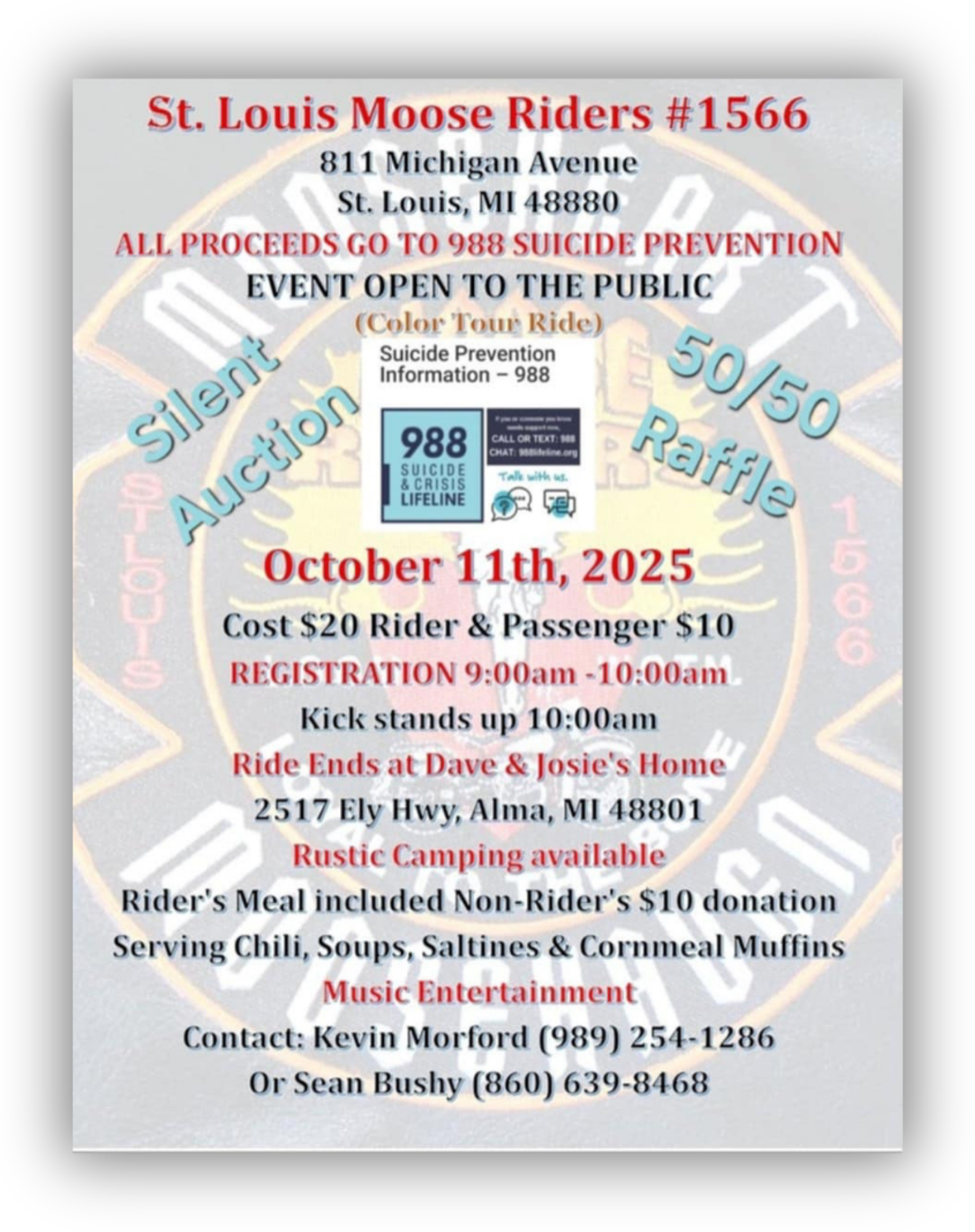 Our Moose Riders were formed in 2012 as a recognized Activity Group by members within the Moose Lodge in St Louis, Michigan. We were brought together by a mutual interest in motorcycling to support the Moose fraternity’s goals of helping children and seniors. We host monthly meetings and regular rides, volunteer for local and national charities, and fundraise for causes like Mooseheart, Moosehaven, Special Olympics, Royal Family Kids, 988-Suicide and Crisis Lifeline, and others each year. Membership is open to any good-standing Moose member, regardless of whether they ride a motorcycle or not. Participation is a positive way to get involved with the organization and benefit our local community.